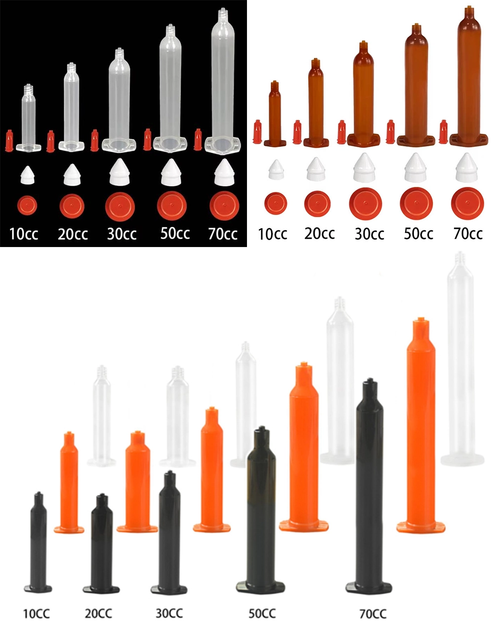 Przezroczysta strzykawka nadaje się do wszelkiego rodzaju klejów do opakowań elektronicznych, klejów przewodzących, topników, klejów SMT w kolorze czerwonym, olejów smarowych, farb itp. Czarna strzykawka nadaje się do klejów UV, klejów utwardzanych światłem oraz w sytuacjach, gdy wymagane jest cieniowanie na czarno. Bursztynowa strzykawka nadaje się do ogólnych prac z ochroną UV; długotrwałe przechowywanie kleju UV nie jest zalecane. Materiał: PP